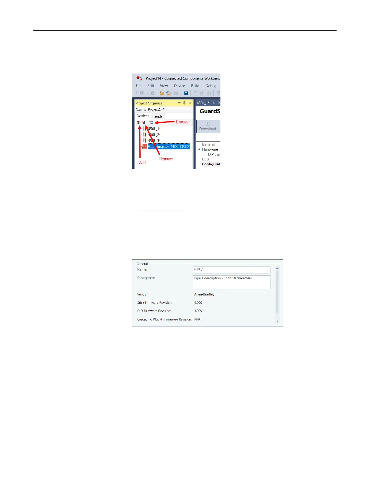 Click the icons in the Project Organizer add, remove, or discover devices.
