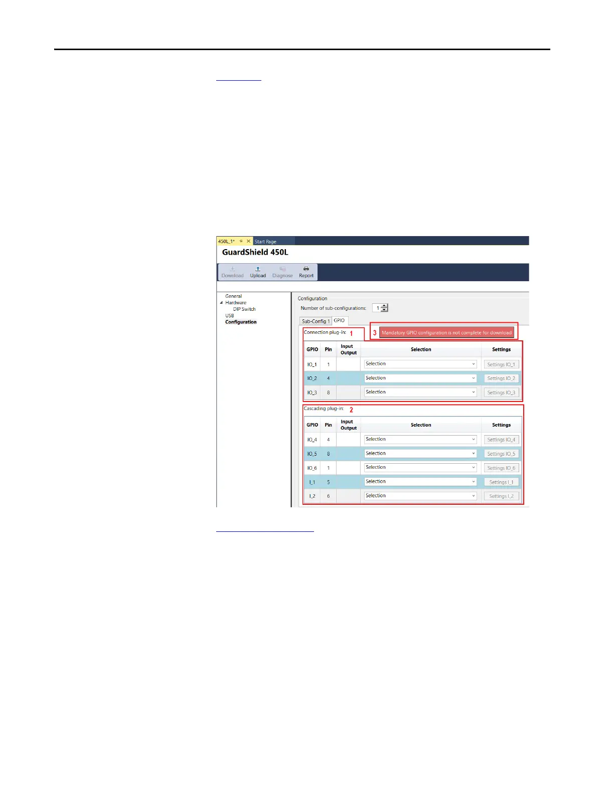 The configuration cannot be downloaded to the stick until the mandatory GPIO