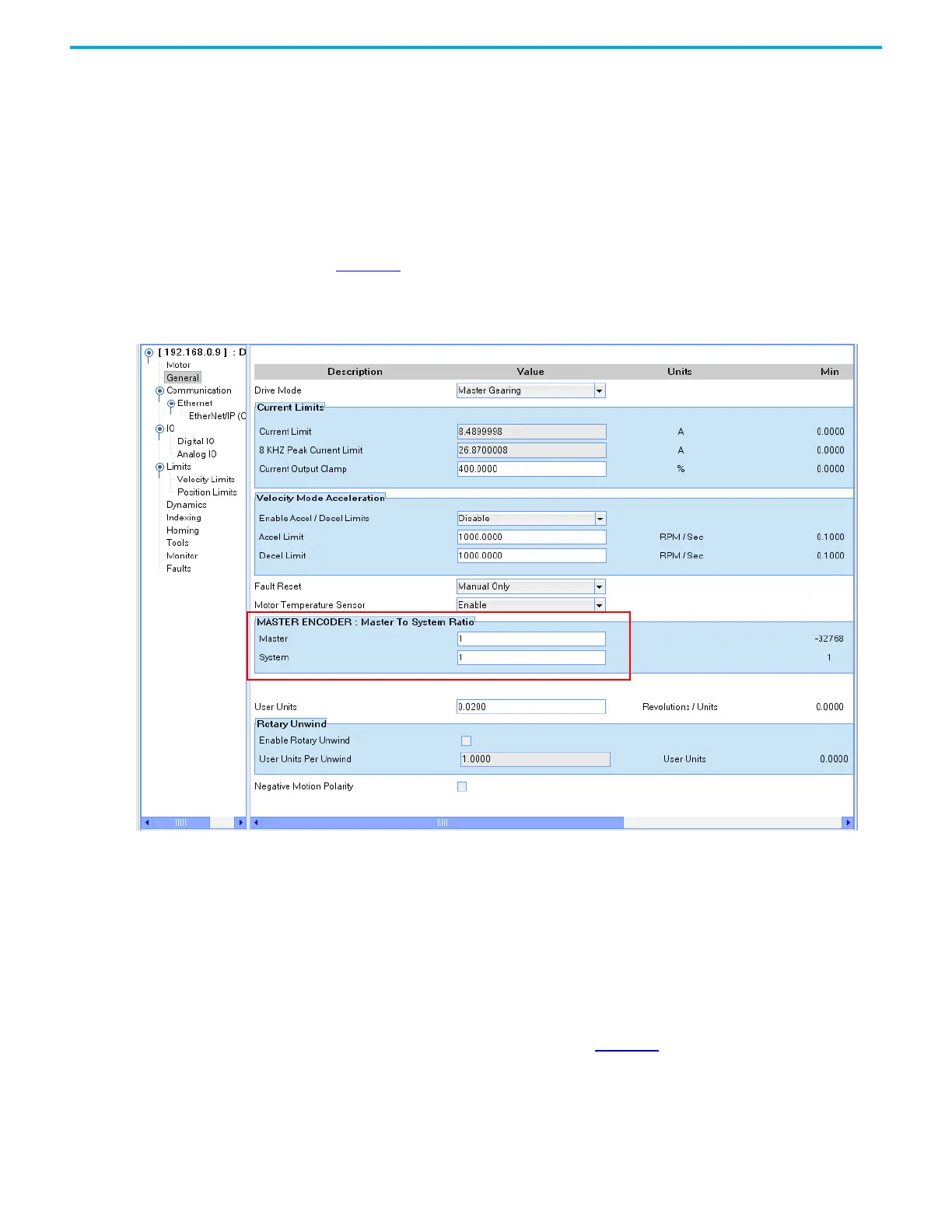 The E-Gear Ratio defines the gearing relationship. The Numerator and