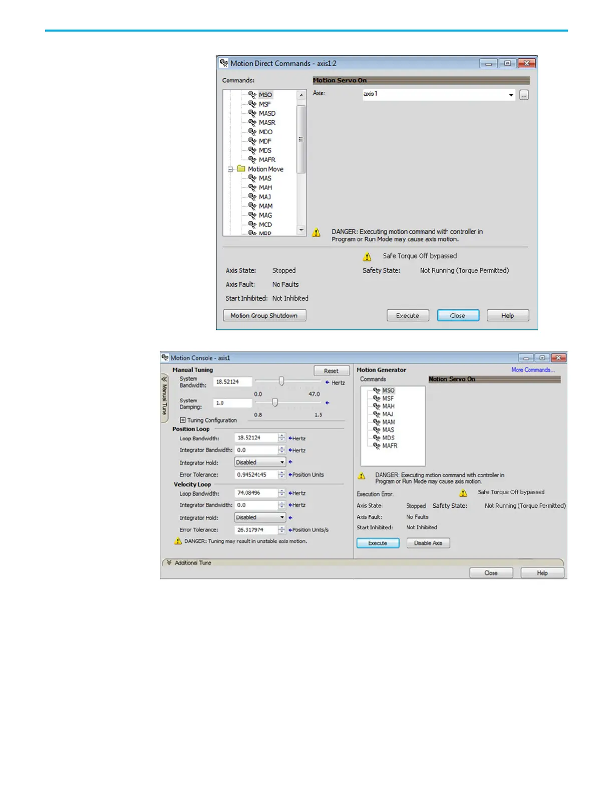Figure 87 - Axis and Safe State Indications on Motion Direct Commands Dialog Box
