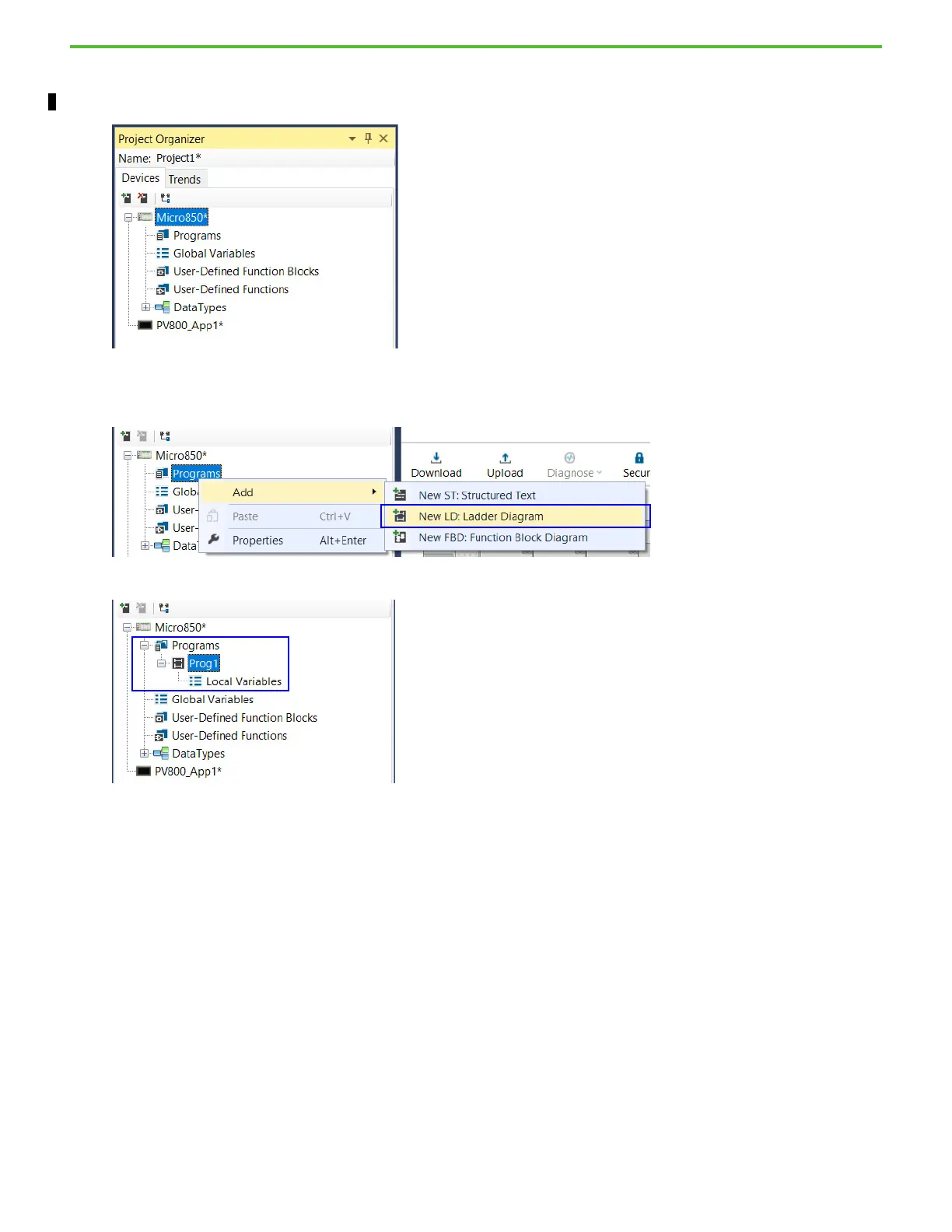 1. Right-click Programs under the Micro850 controller in your Project Organizer, and select Add > New LD : Ladder Diagram.