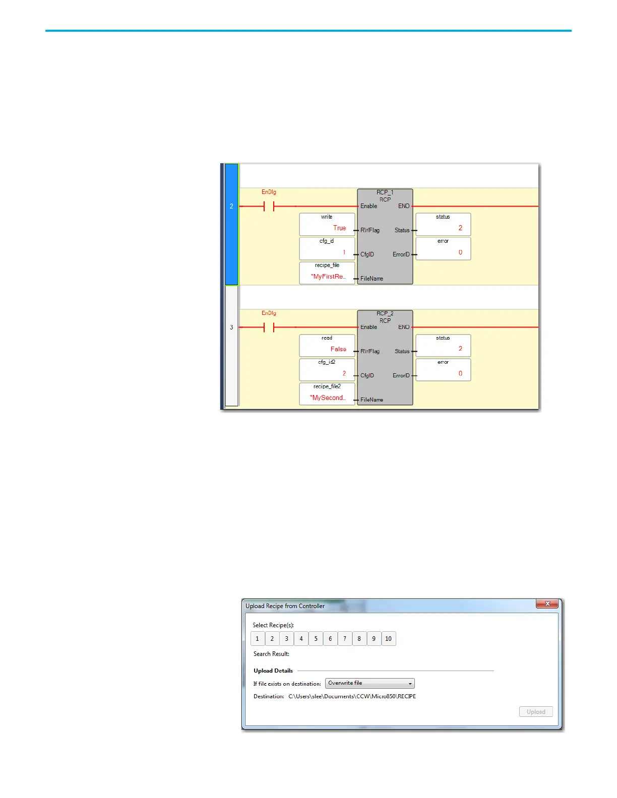 Execute the RCP function block. Notice the Status output go from 0 (Idle) to