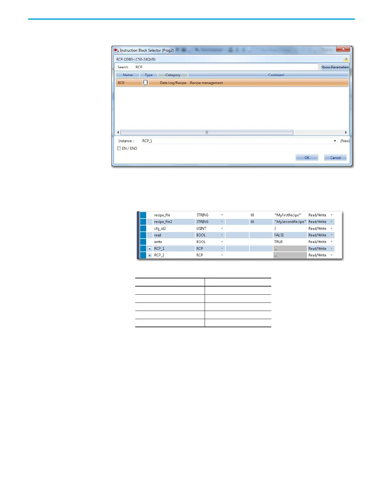 5. On the Block Selector window that appears, type RCP to filter the Recipe function block