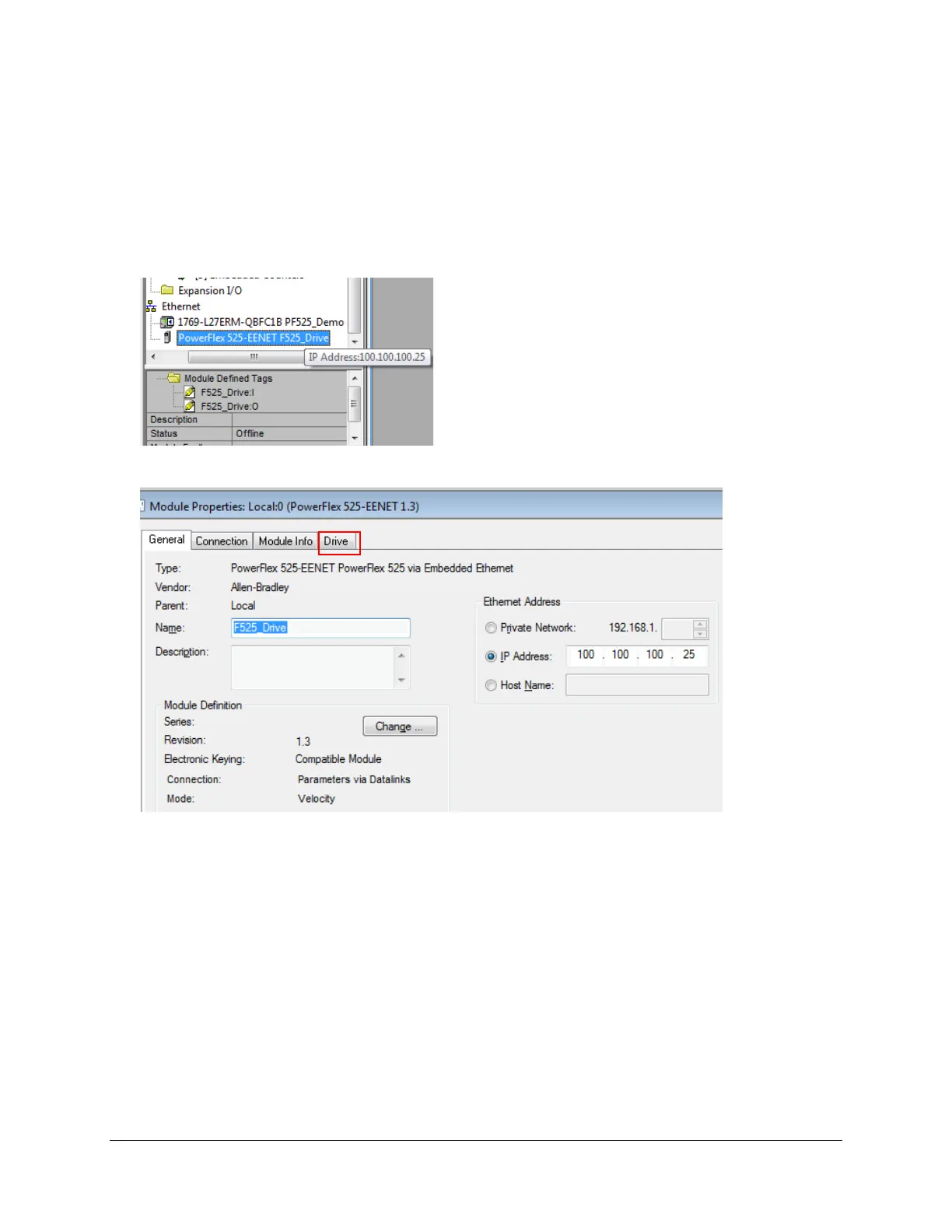 For the PowerFlex 525 Add-On Profile, the Drive tab utilizes Connected Components Workbench™, so when compared to