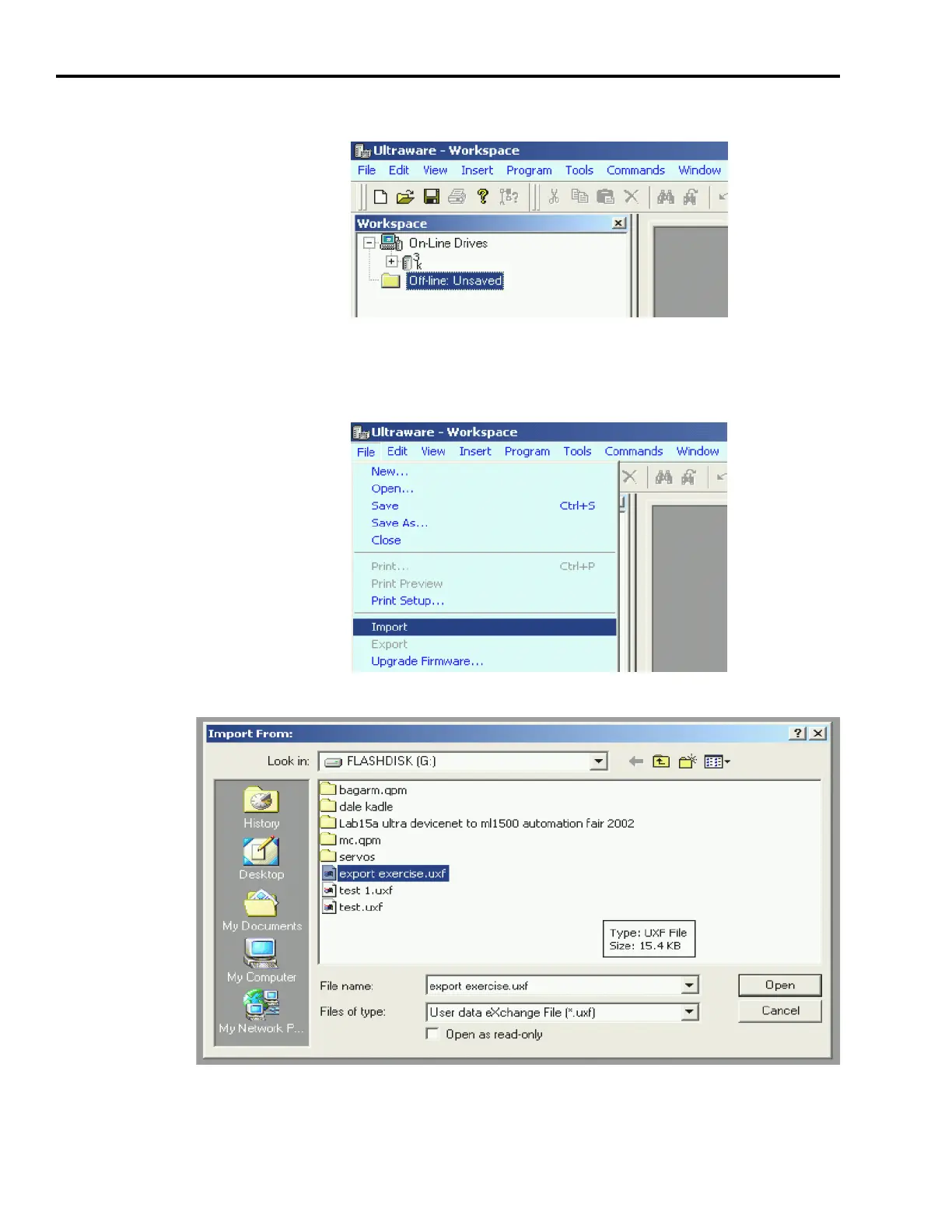 In this example, export exercise.uxf is the file to import.