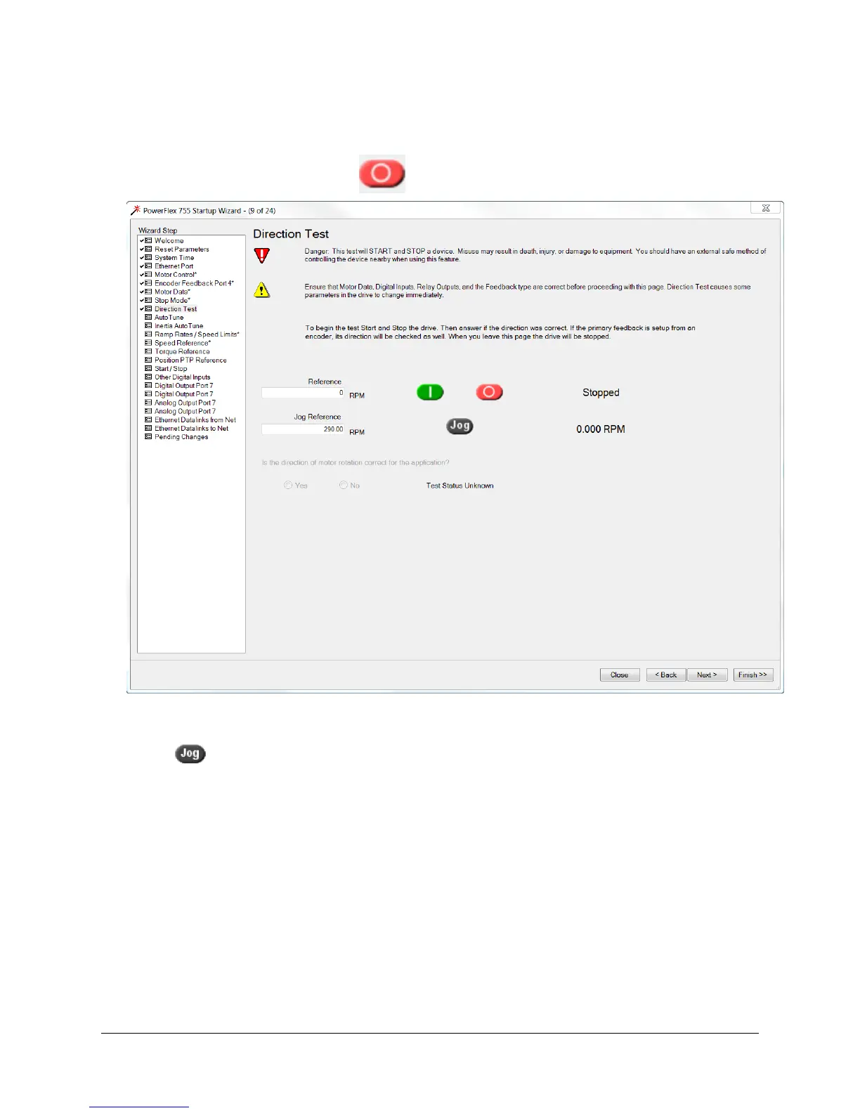 34. The Direction Test step is next. It helps you determine if the motor is rotating in the proper direction for your