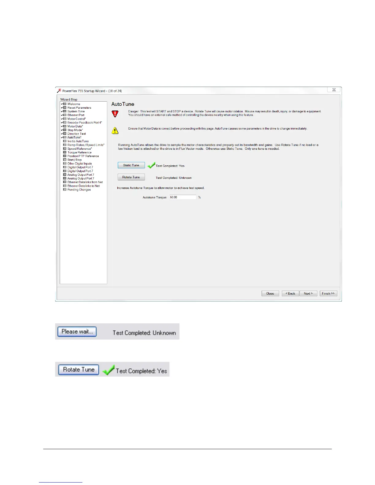 Leaving the AutoTune page while the test is in process will abort the test, faulting the drive. Do not leave AutoTune page
