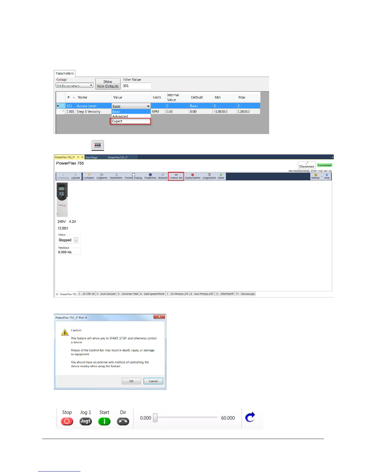 48. Use the buttons on the left-hand side of the control bar to start, stop, jog, and control the direction of the drive.