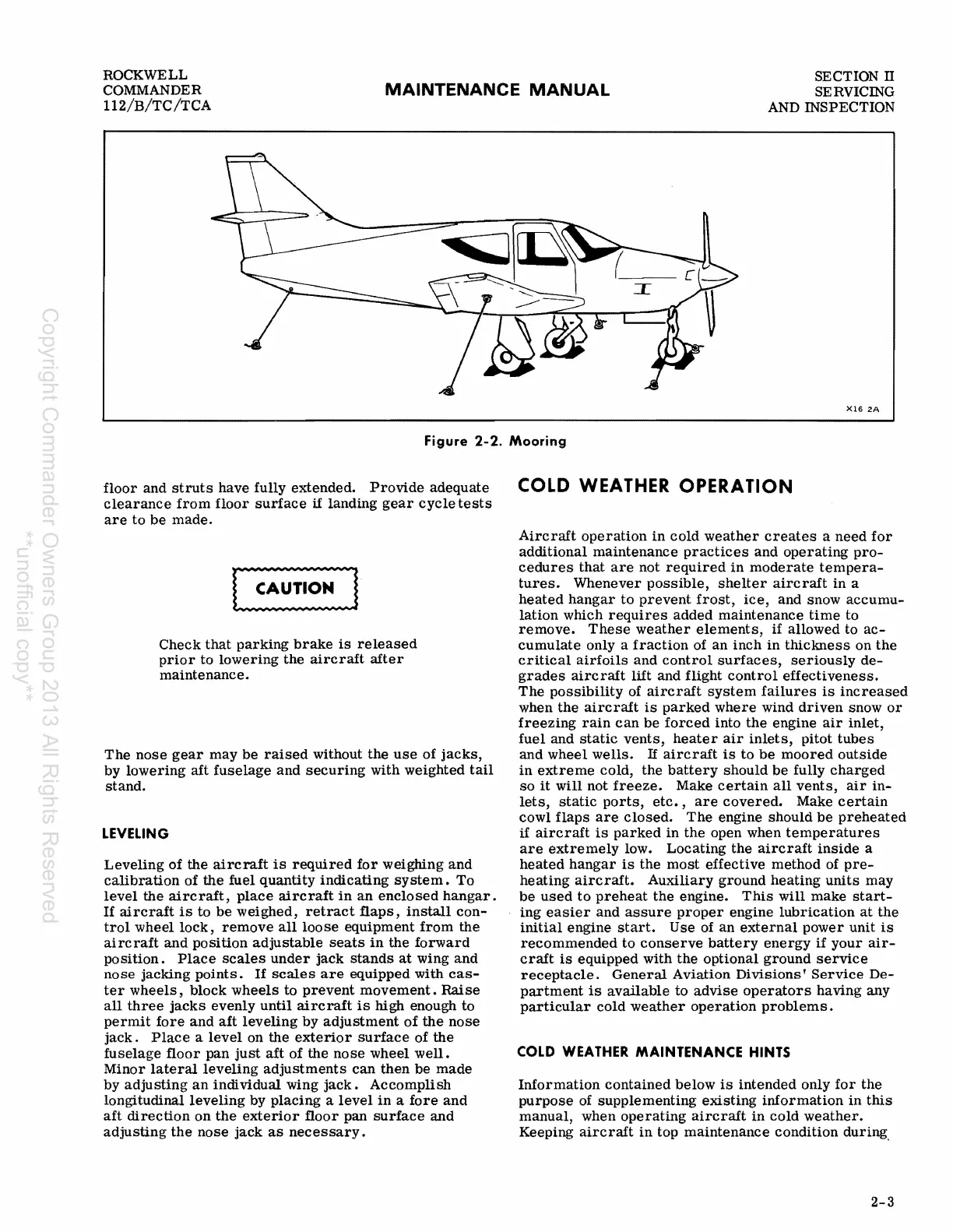 Rockwell Commander 112 - Cold Weather Maintenance Hints; Cold Weather Operation; Leveling