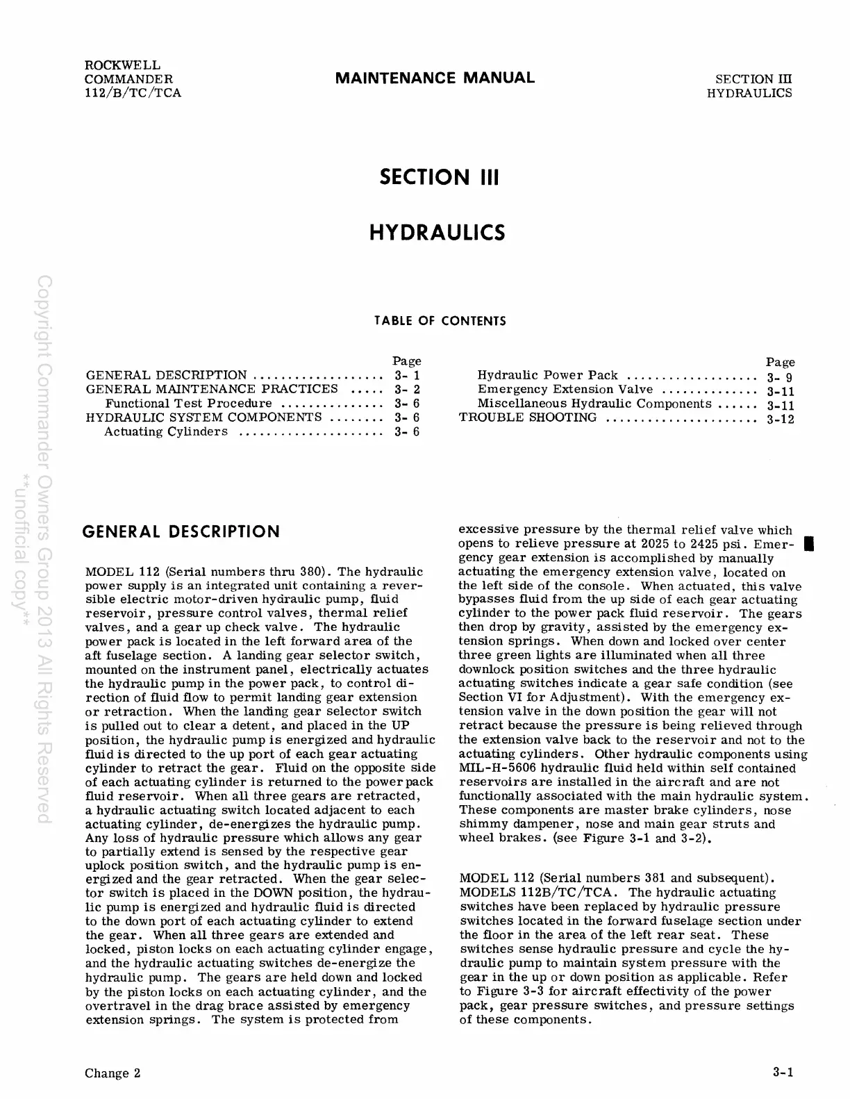 Rockwell Commander 112 - SECTION III HYDRAULICS; GENERAL DESCRIPTION