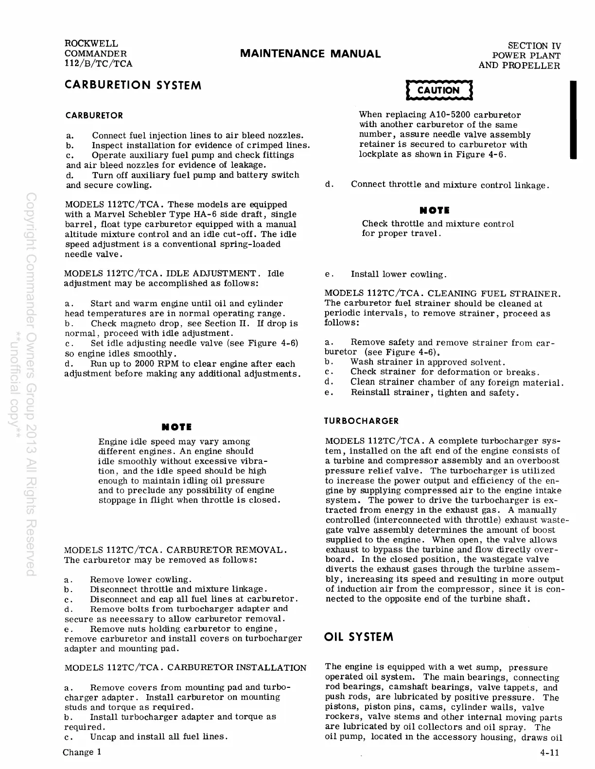 Rockwell Commander 112 - Carburetor; OIL System; Turbocharger