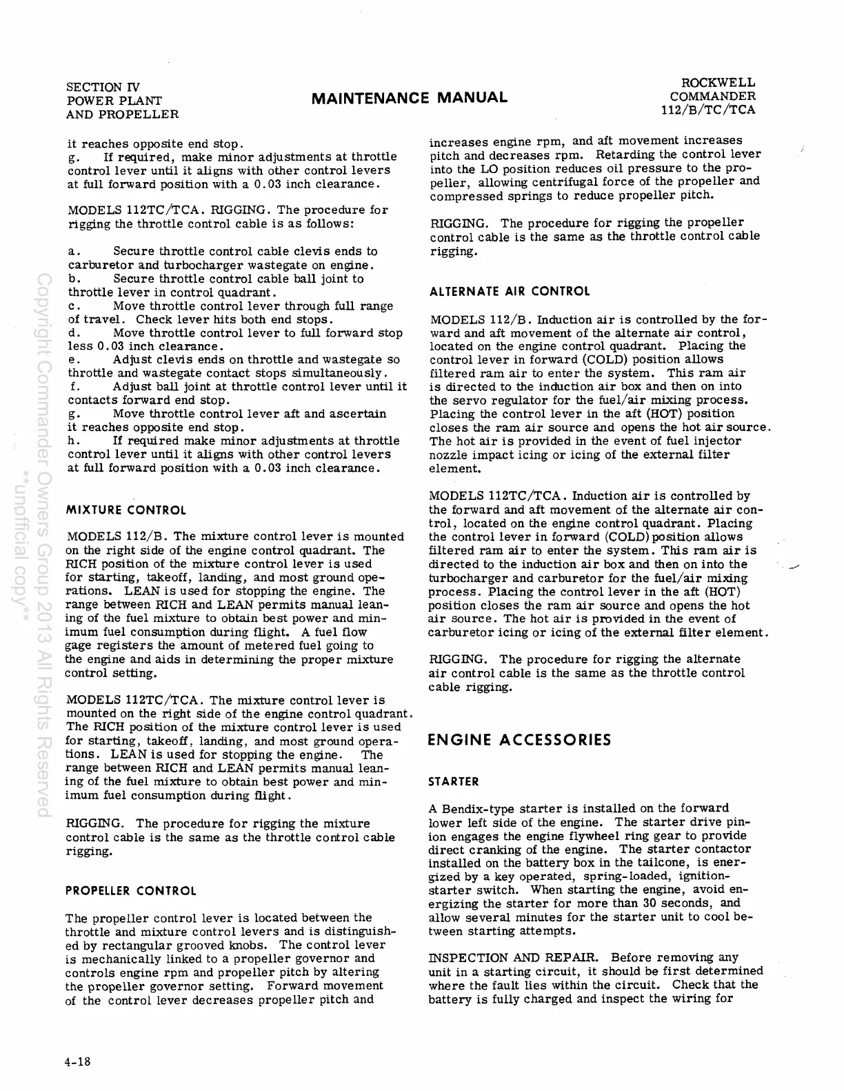 Rockwell Commander 112 - Alternate Air Control; Engine Accessories; Mixture Control; Propeller Control