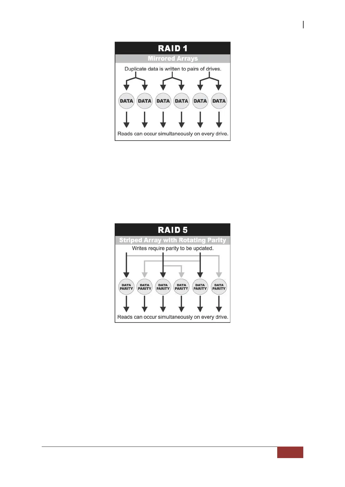 dedicated parity drive, all drives contain data and read operations can be overlapped on