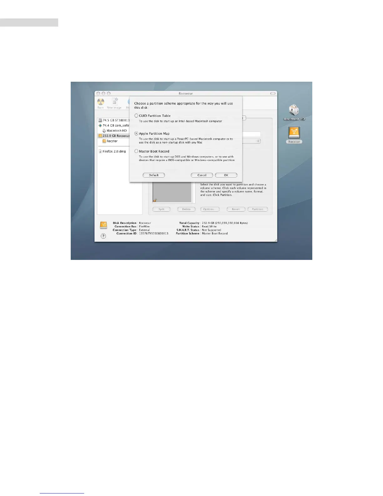 PartitionSchemeforyourRocstordrive.Suggestyouselect“ApplePartitionMap”then