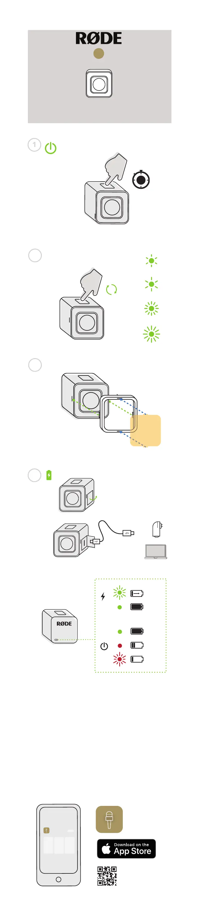 RODE Microphones iOS Vlogger Kit - MicroLED Operation and Charging; Powering On and Brightness; Connecting to Mobile Device; Charging and Battery Status