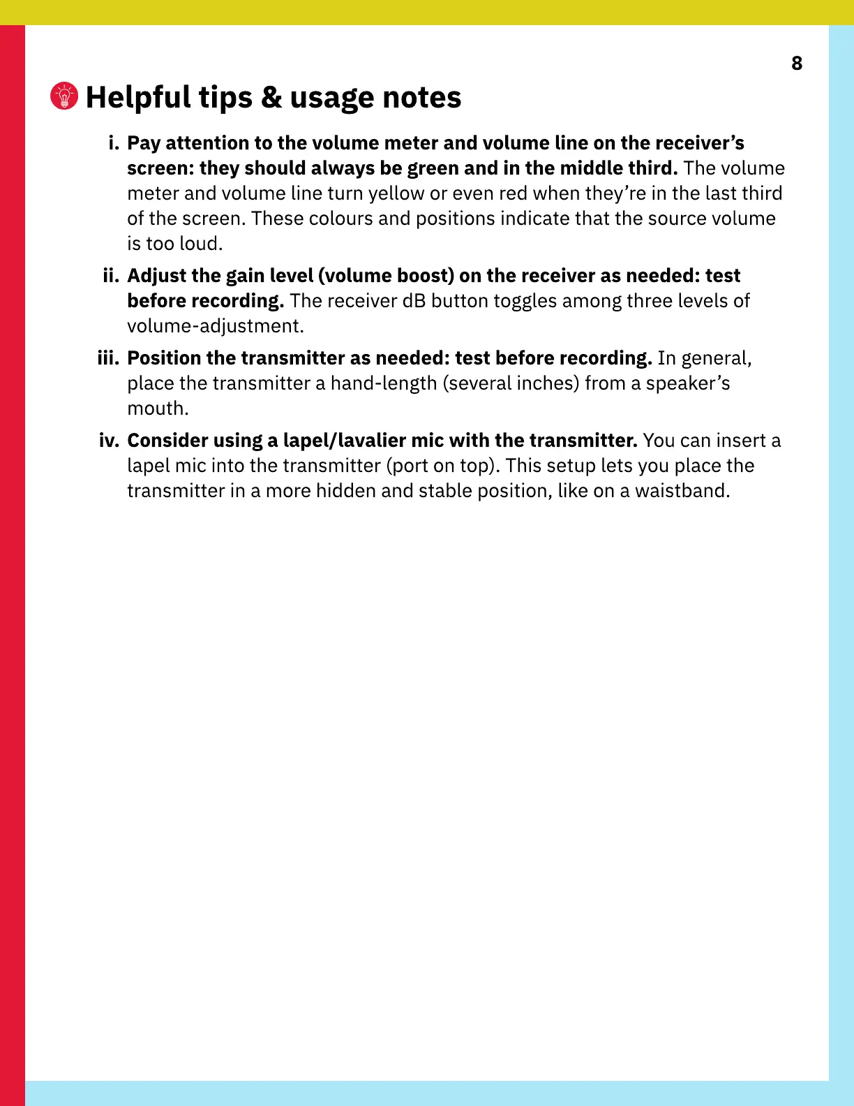 iii. Position the transmitter as needed: test before recording. In general,