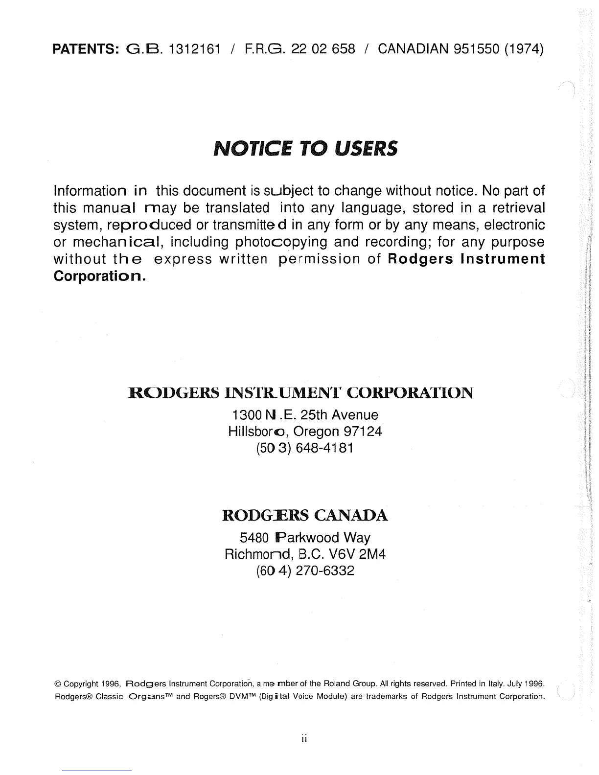 Rodgers 525 - NOTICE TO USERS