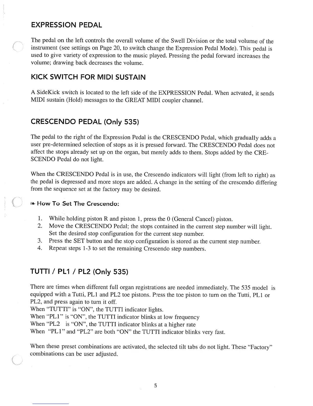 Rodgers 525 - EXPRESSION AND MIDI SUSTAIN CONTROLS; CRESCENDO PEDAL (Only 535); TUTTI; PL1; PL2 (Only 535)