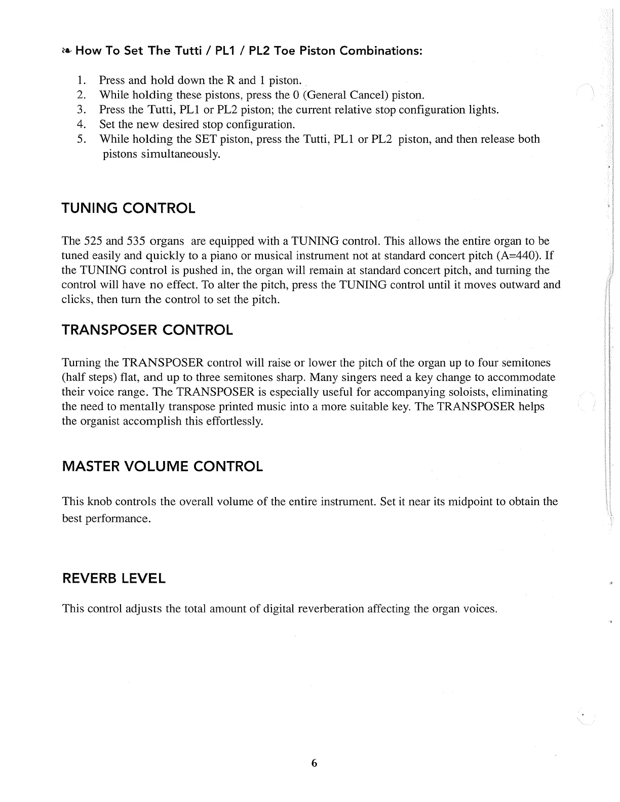 The 525 and 535 organs are equipped with a TUNING control. This allows the entire organ to be