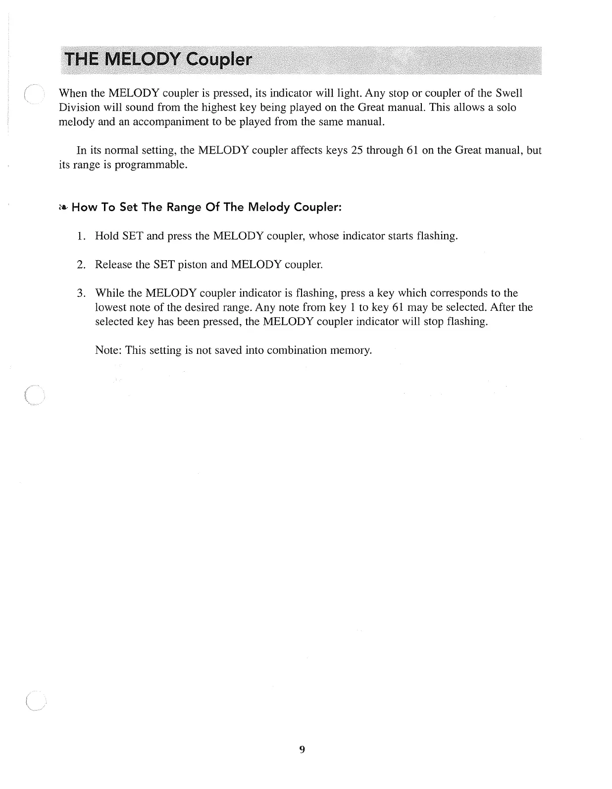 Hold SET and press the MELODY coupler, whose indicator starts flashing.