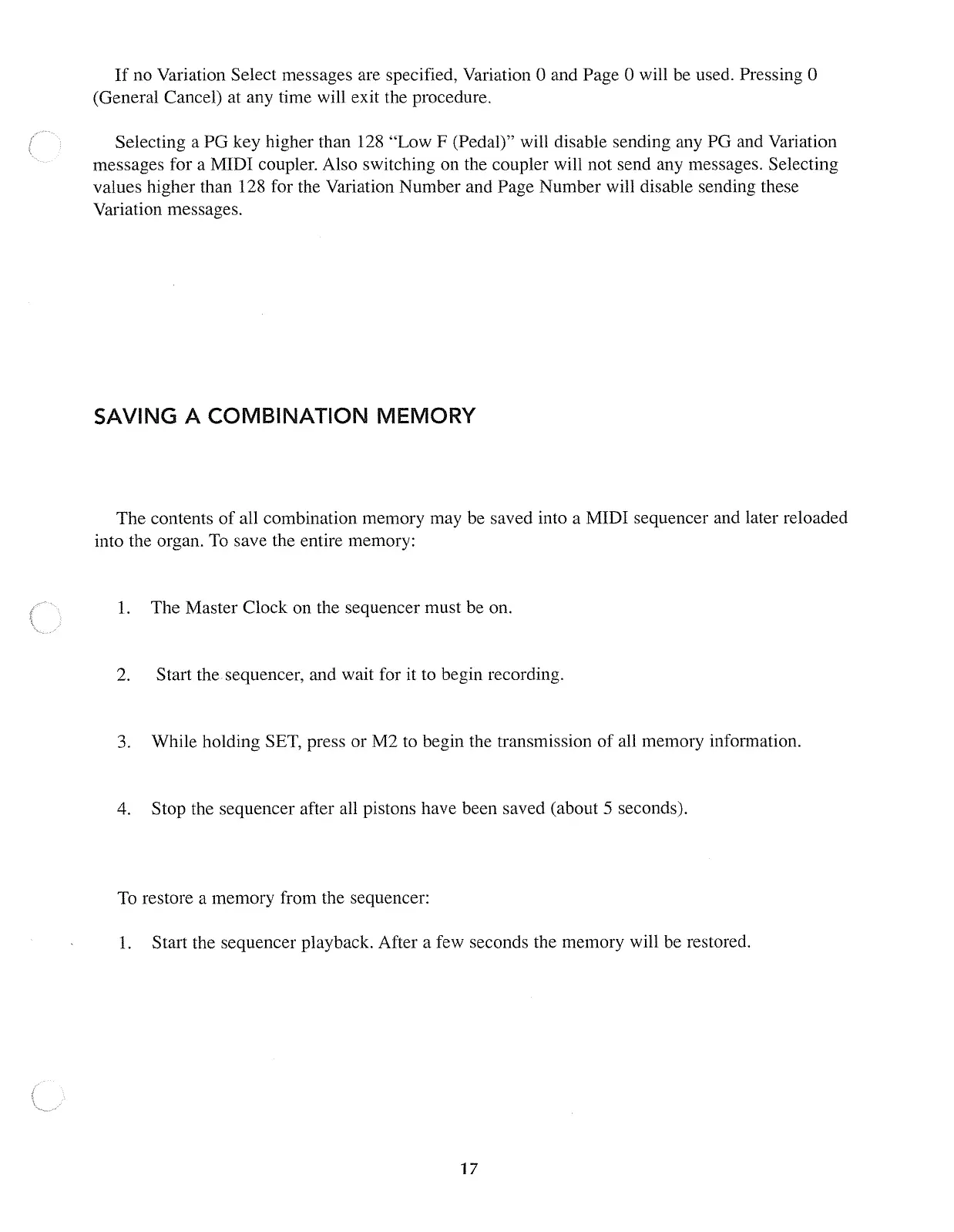The contents of all combination memory may be saved into a MIDI sequencer and later reloaded