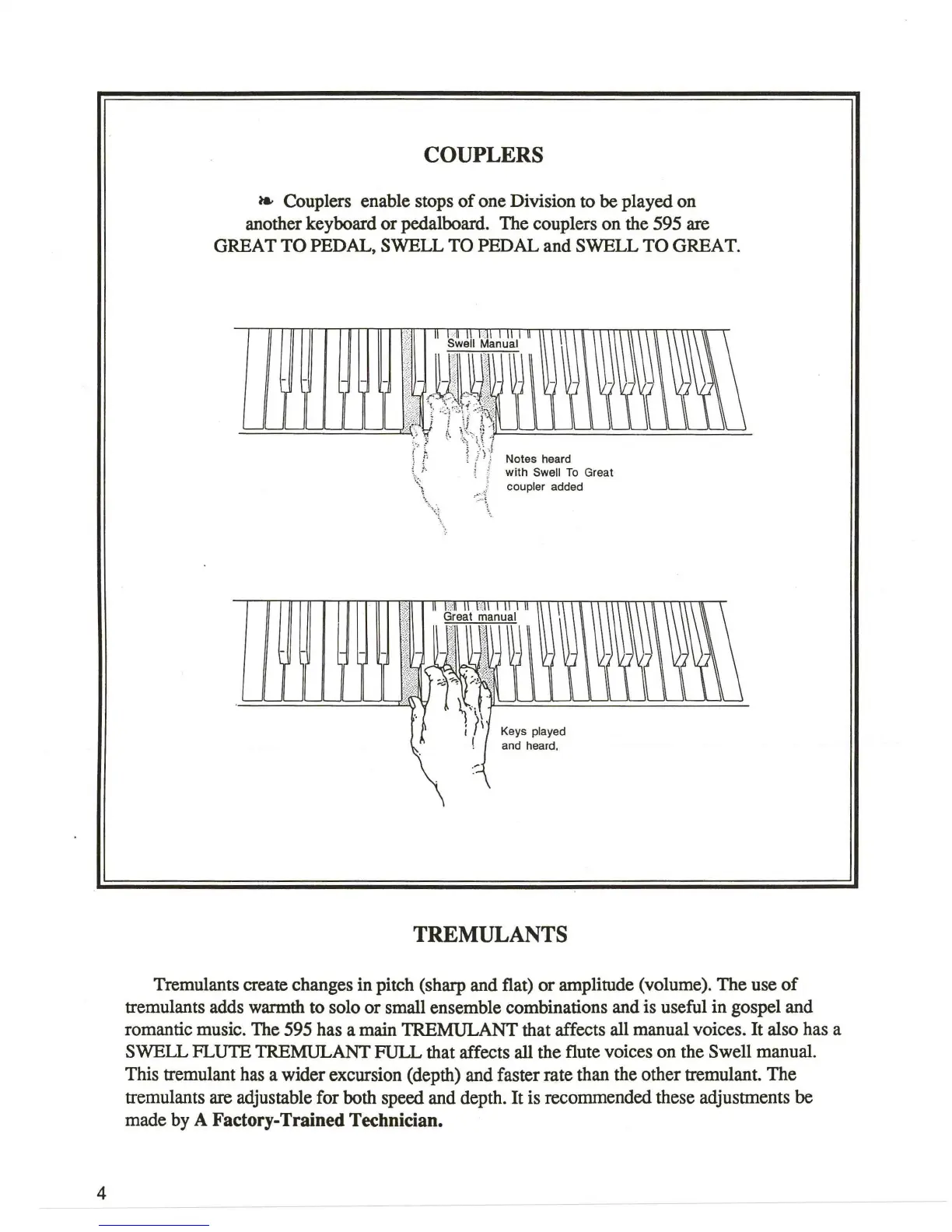 romantic music. The 595 has a main TREMULANT that affects all manual voices. It also has a