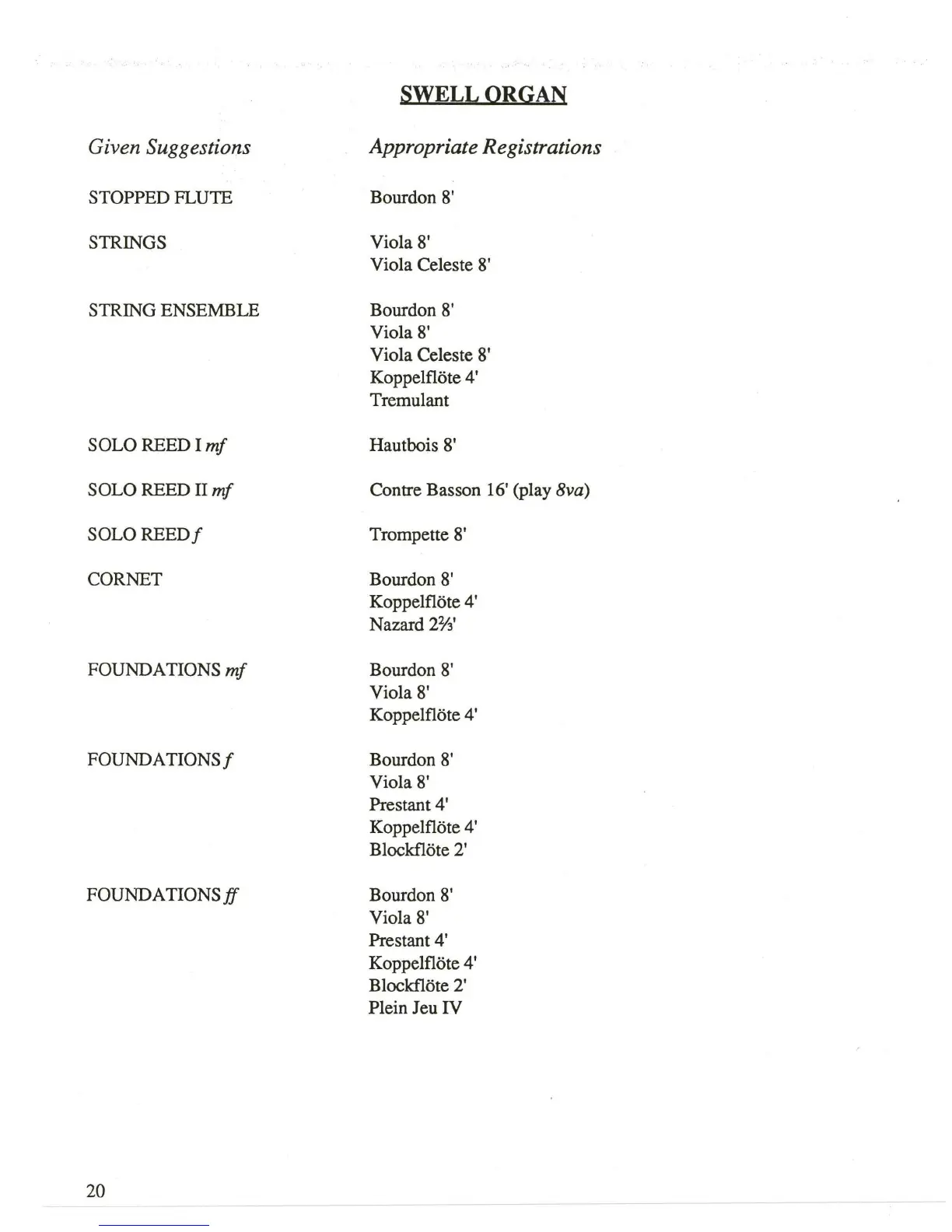 Rodgers 595 - Swell Organ Registrations; Pedal Organ Registrations; Ensemble Combinations