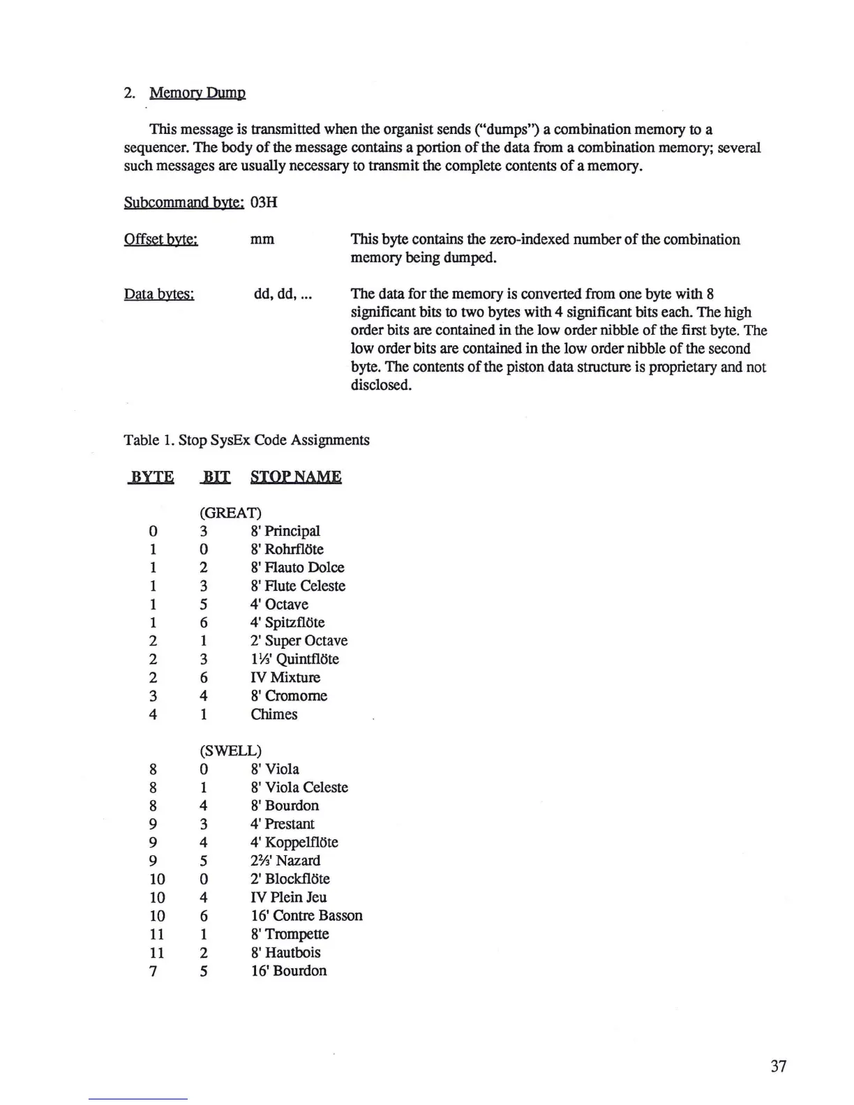 This message is transmitted when the organist sends ("dumps") a combination memory to a