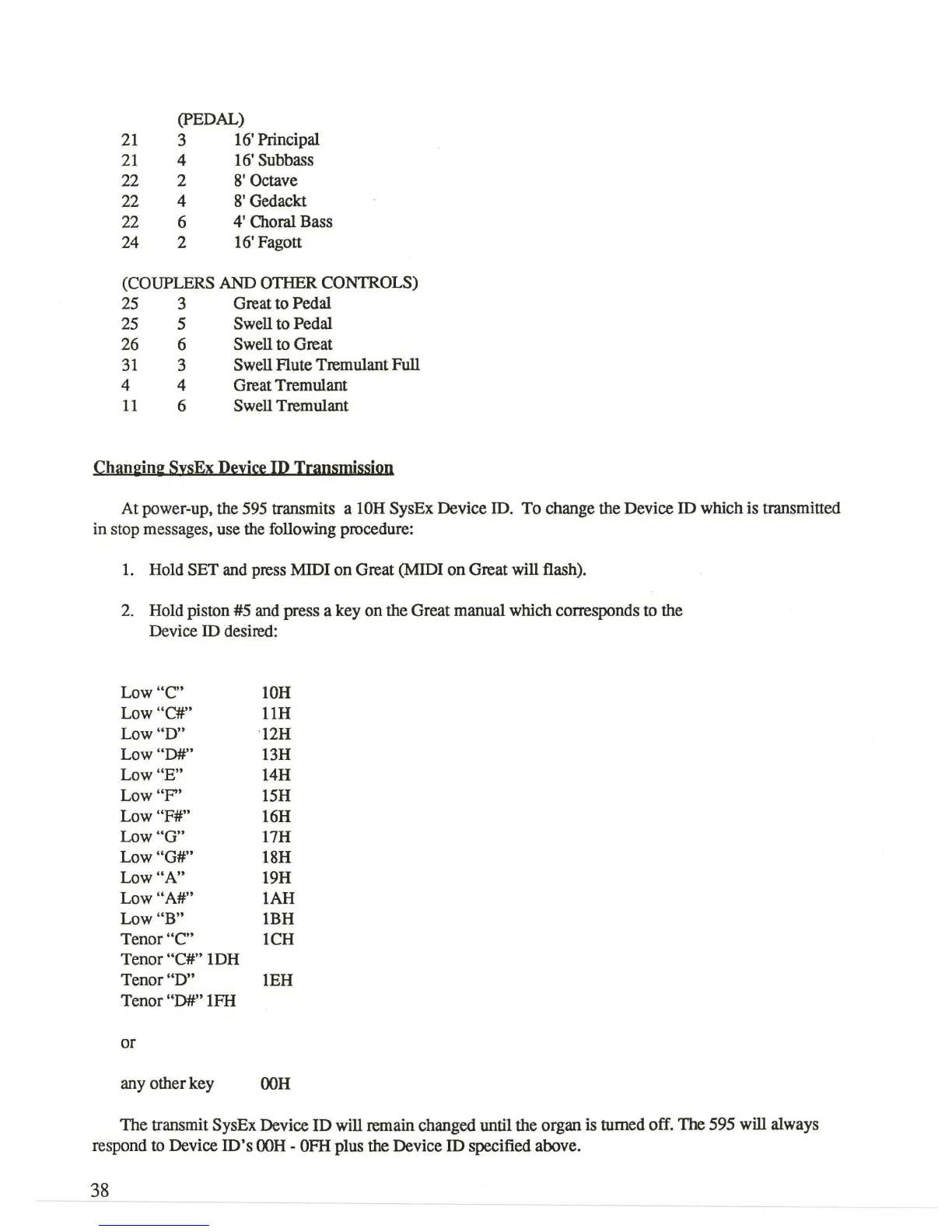 The transmit SysEx Device ID will remain changed until the organ is turned off. The 595 will always