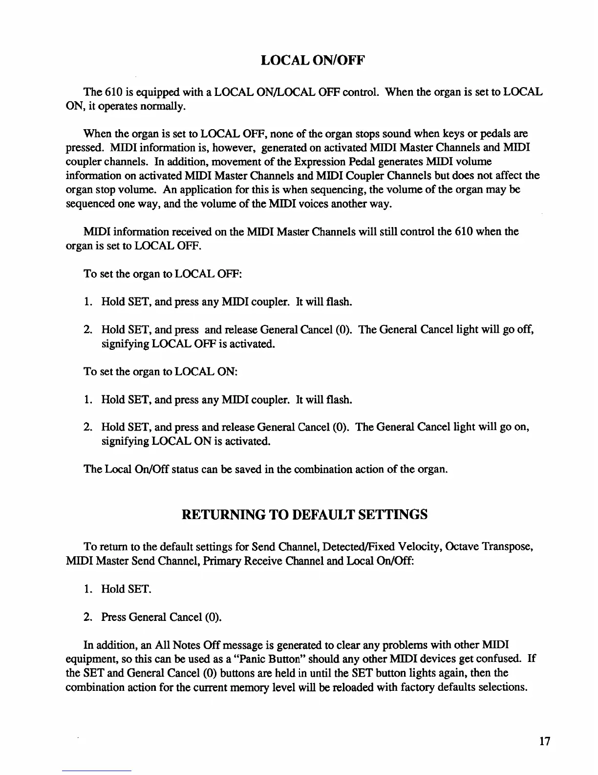 Rodgers 610 - Local On;Off; Returning to Default Settings
