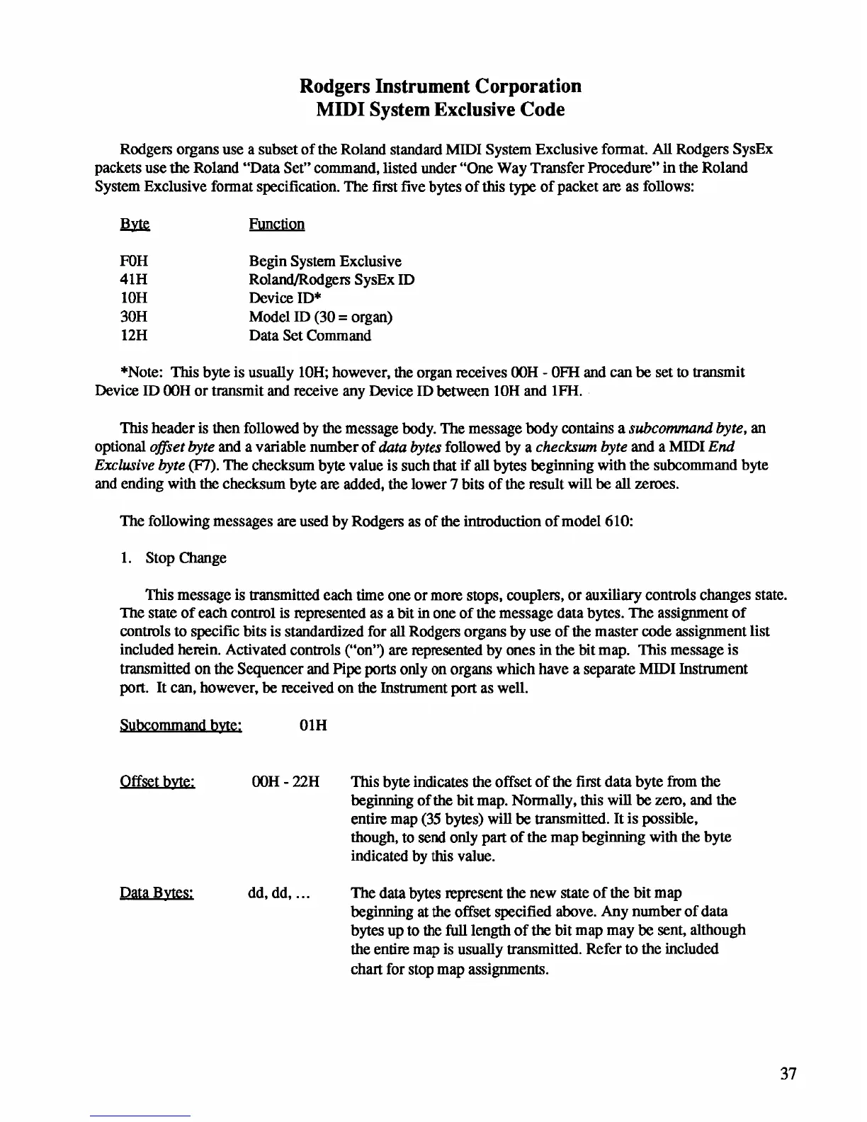 Rodgers 610 - MIDI System Exclusive Code; Stop Change