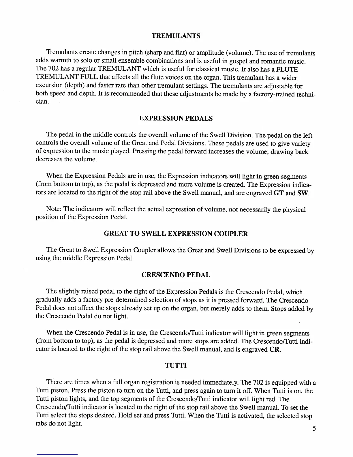 excursion (depth) and faster rate than other tremulant settings. The tremulants are adjustable for