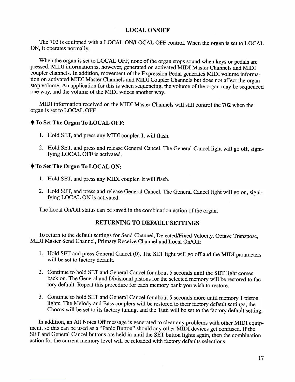 The 702 is equipped with a LOCAL ON/LOCAL OFF control. When the organ is set to LOCAL