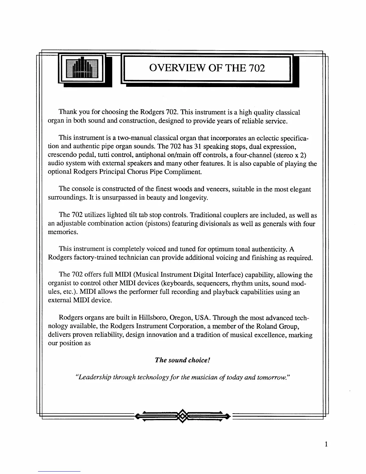 Thank you for choosing the Rodgers 702. This instrument is a high quality classical