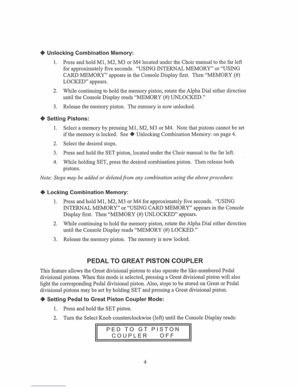 Rodgers 950B - Pedal to Great Piston Coupler; Unlocking Combination Memory; Setting Pistons; Locking Combination Memory