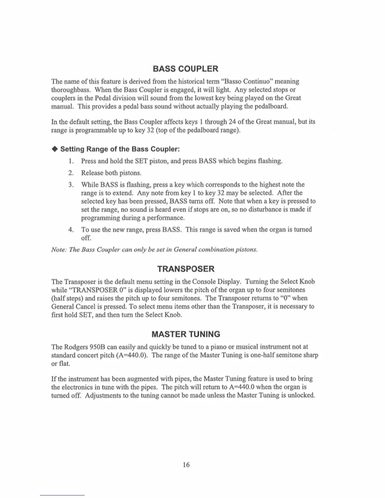 Rodgers 950B - Transposer Functionality; Master Tuning Adjustments