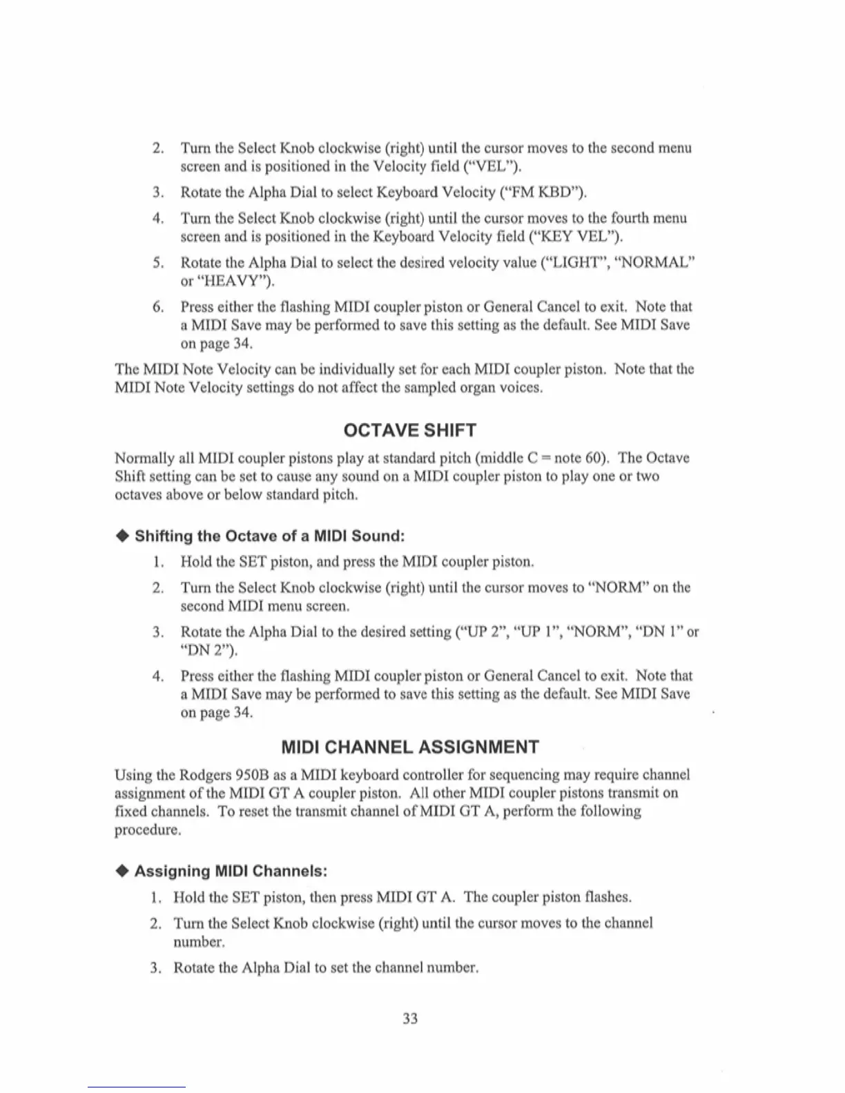 Rodgers 950B - Octave Shift for MIDI Sounds; Shifting MIDI Sound Octaves; MIDI Channel Assignment; Assigning MIDI Channels