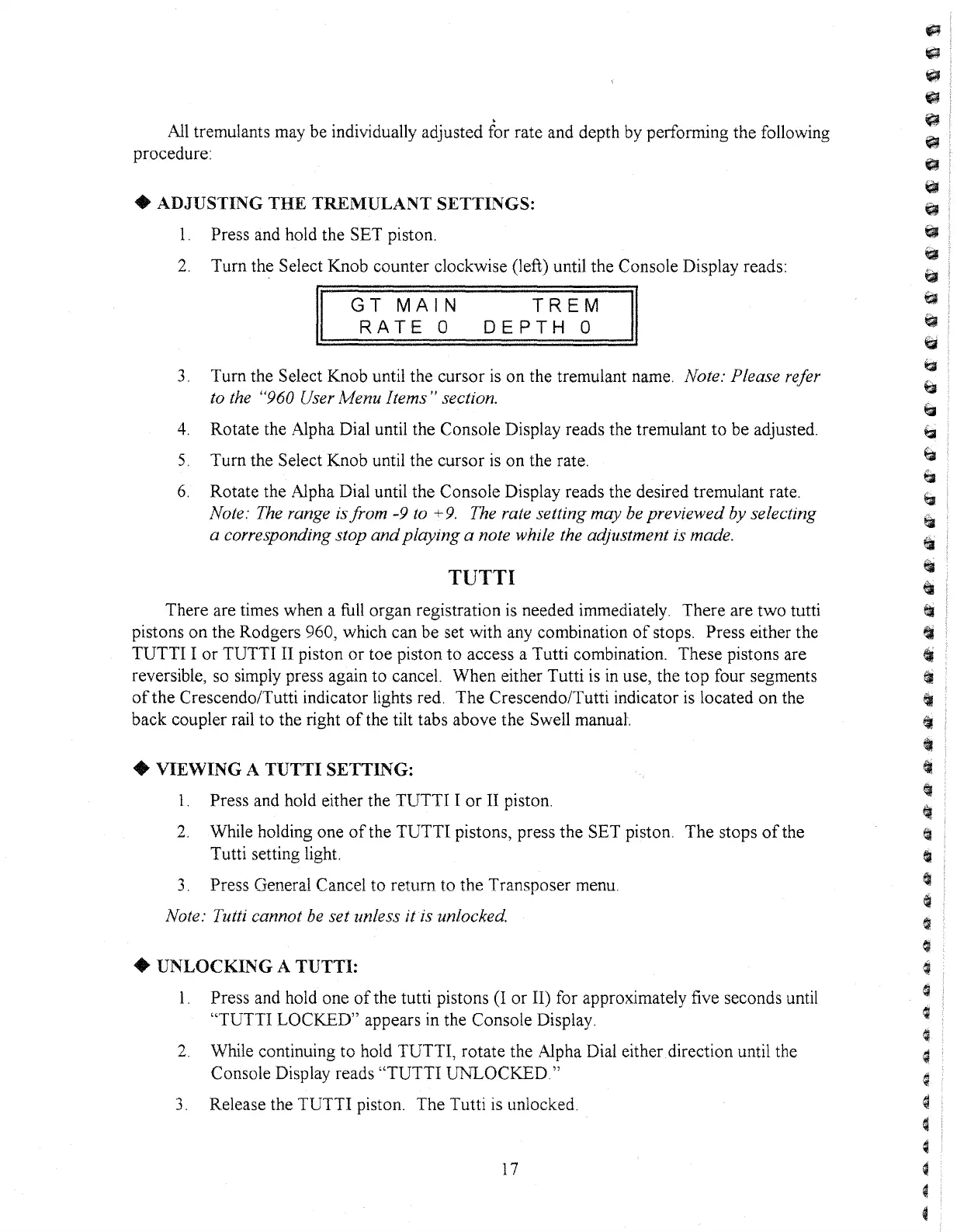 Rotate the Alpha Dial until the Console Display reads the desired tremulant rate.