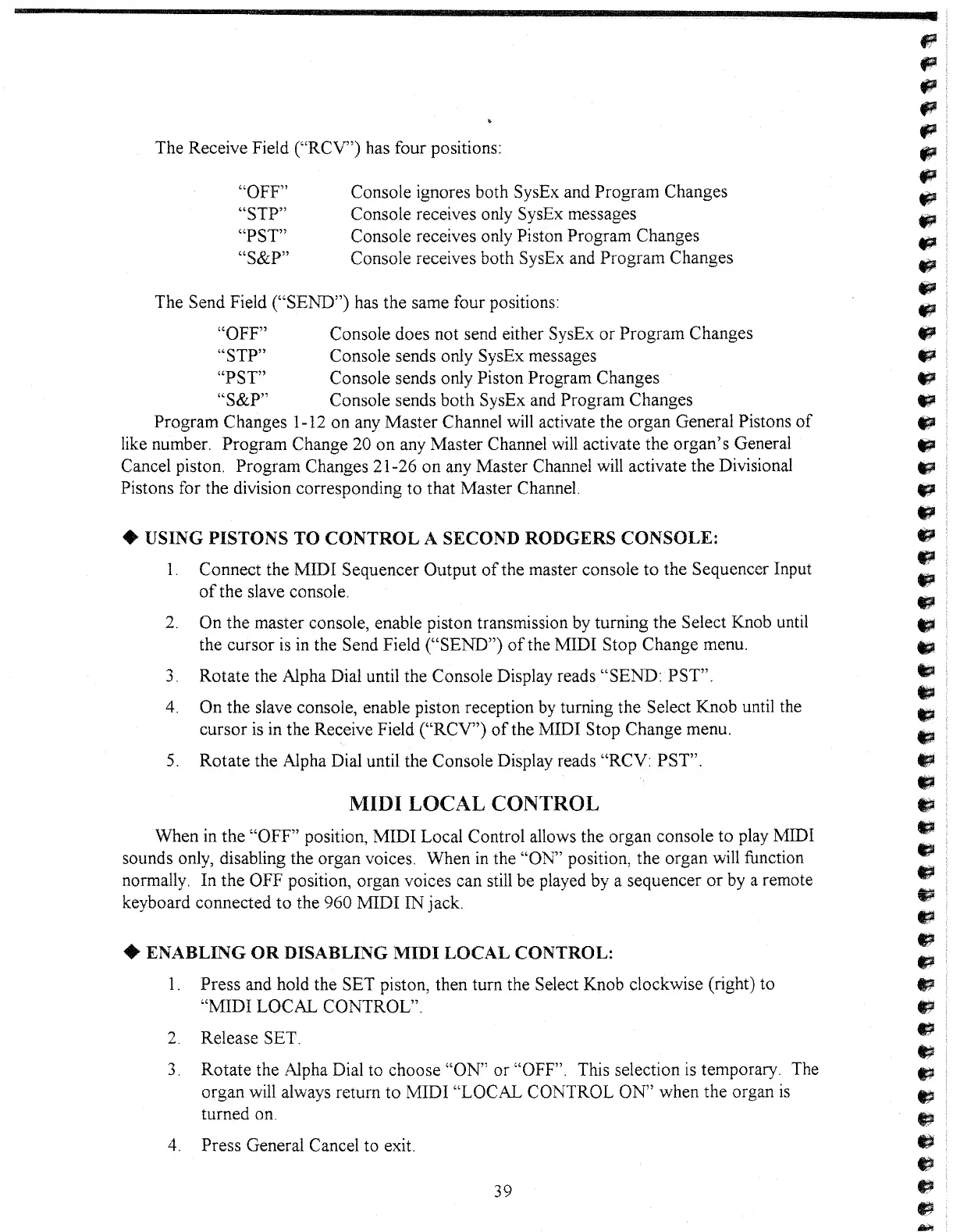 the "OFF" position, MIDI Local Control allows the organ console to play MIDI
