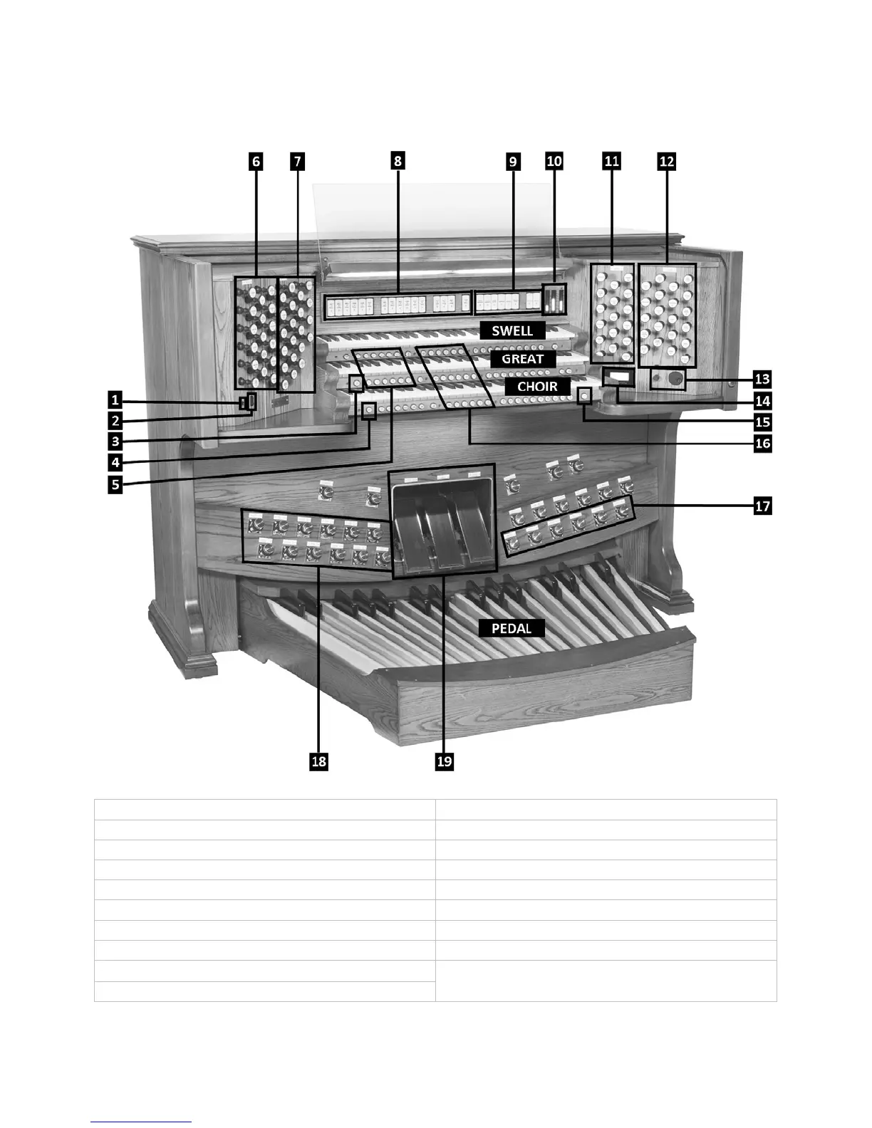6. Pedal stops 16. Divisional thumb pistons (Swell, Great, Choir)