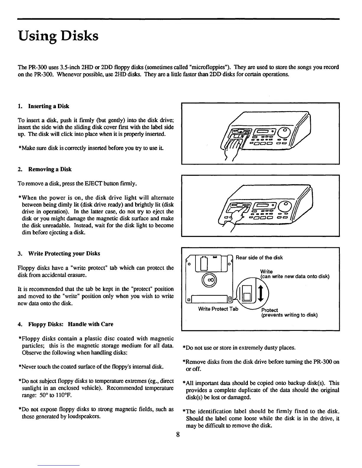 The PR-300 uses 3.5-inch 2HD or 2DD floppy disks (sometimes called "microfloppies"). They are used to store the songs you record