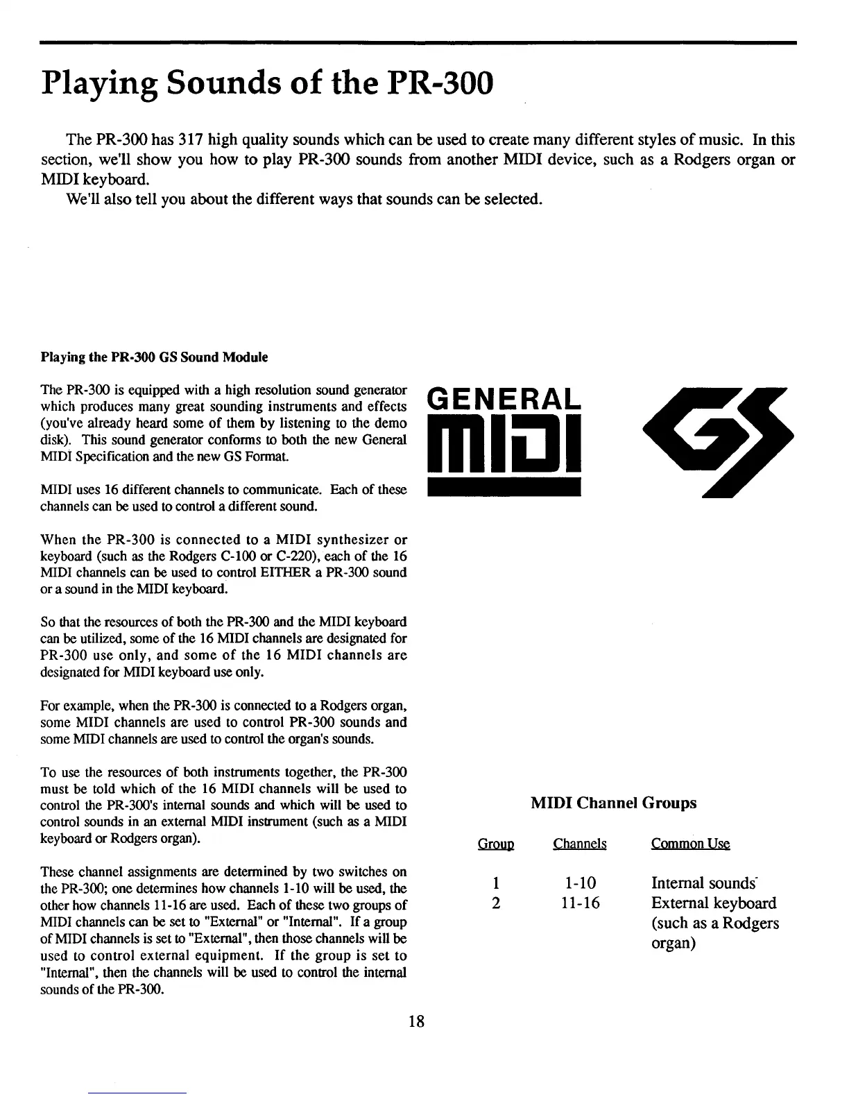 section, we'll show you how to play PR-300 sounds from another MIDI device, such as a Rodgers organ