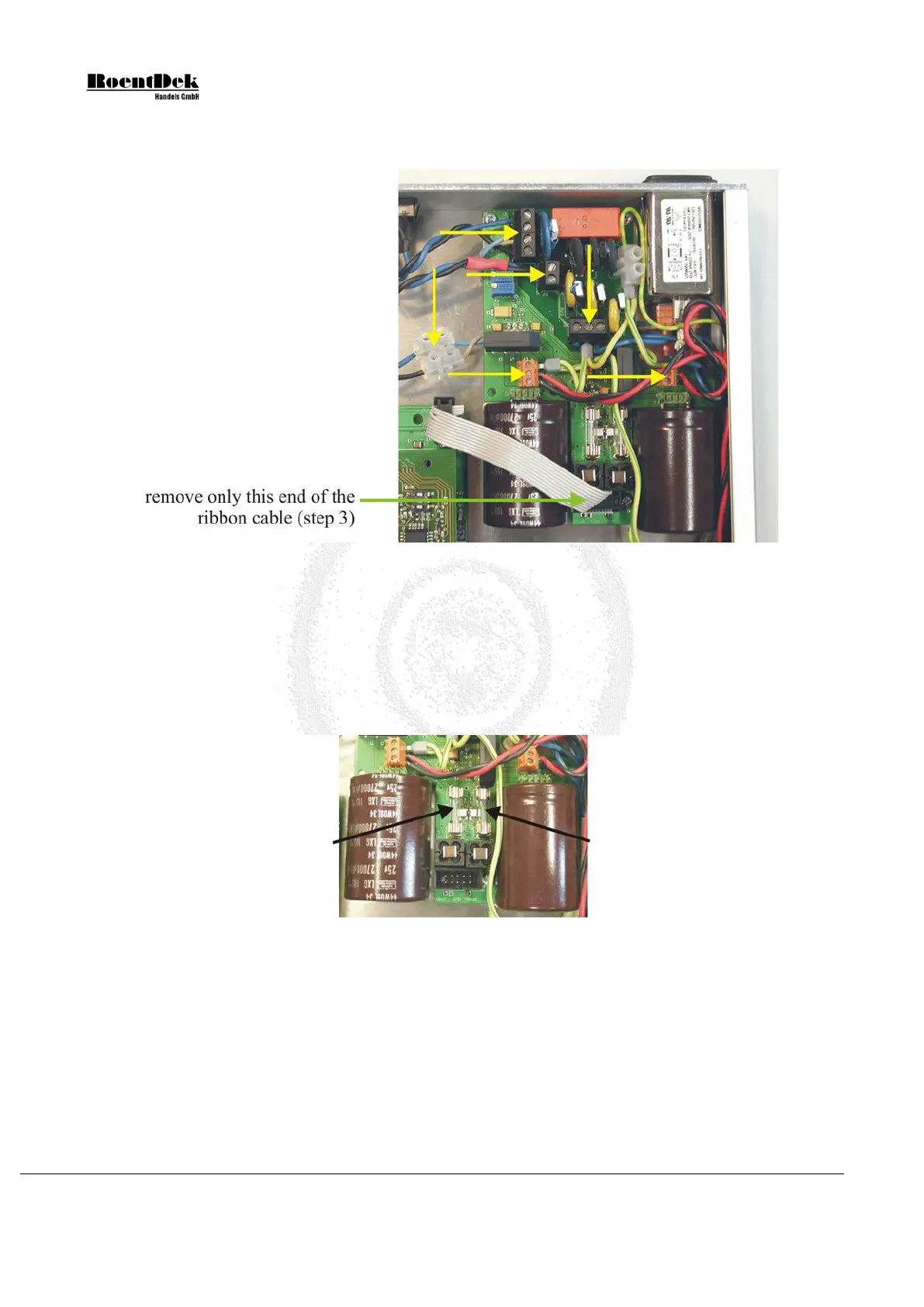 3) Remove the ribbon cable from the power supply (green arrow in the picture above). Make sure not to remove the