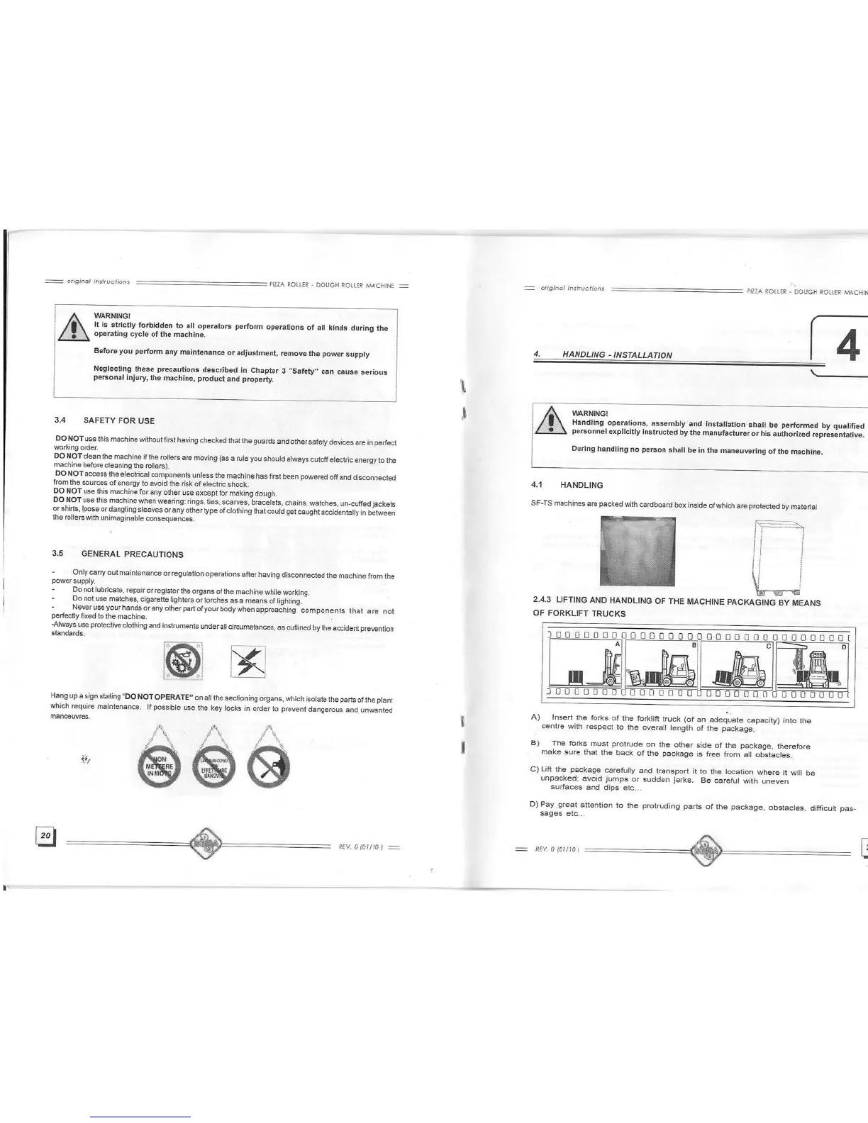 Roga SF250 - Safety During Use, Handling, and Installation; Safety Guidelines for Machine Use; Handling and Installation Safety Procedures; Safe Forklift Handling of Packaging