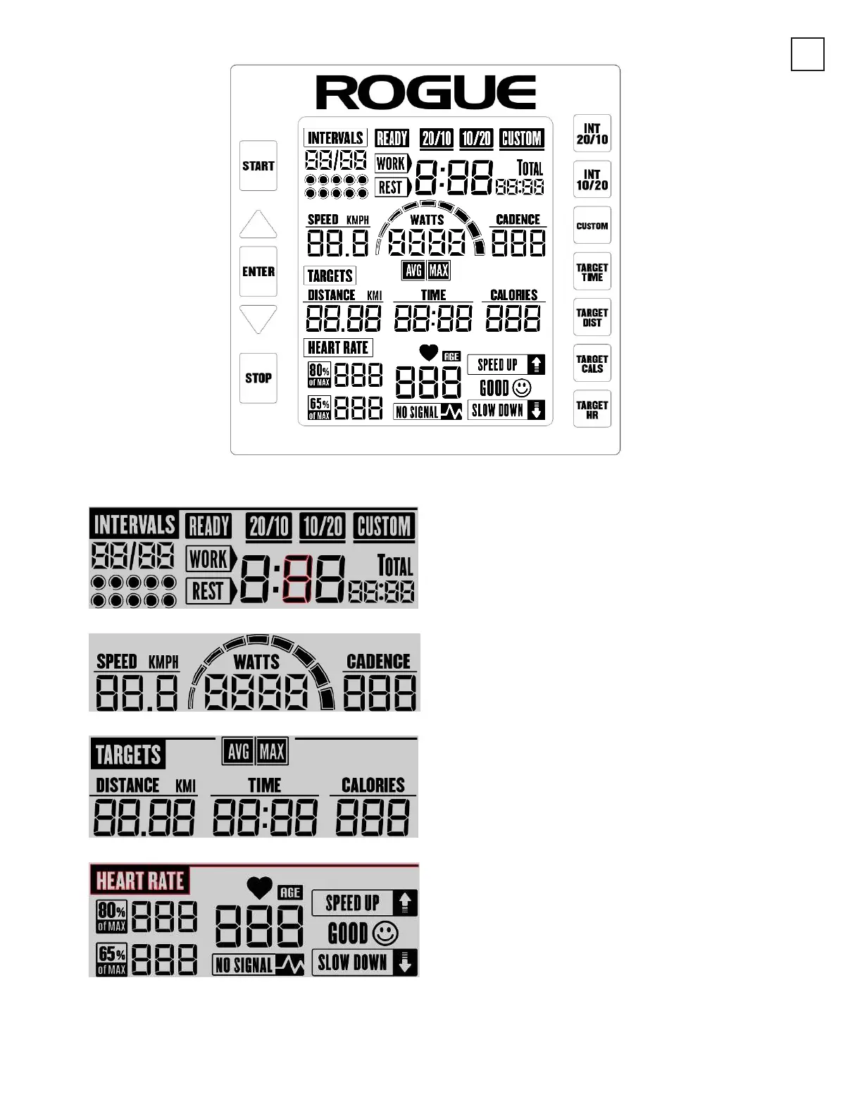 There are four major sections on the display, presenting different sets of exercise data to the user: