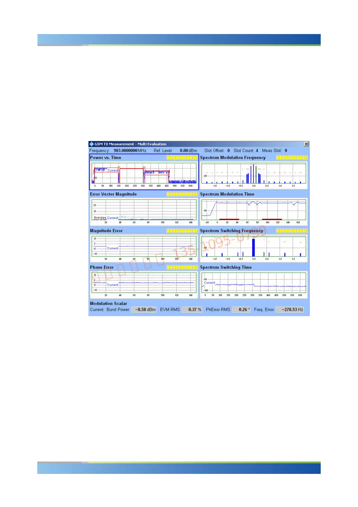 The GSM "Multi Evaluation" measurement dialog shows all results in several