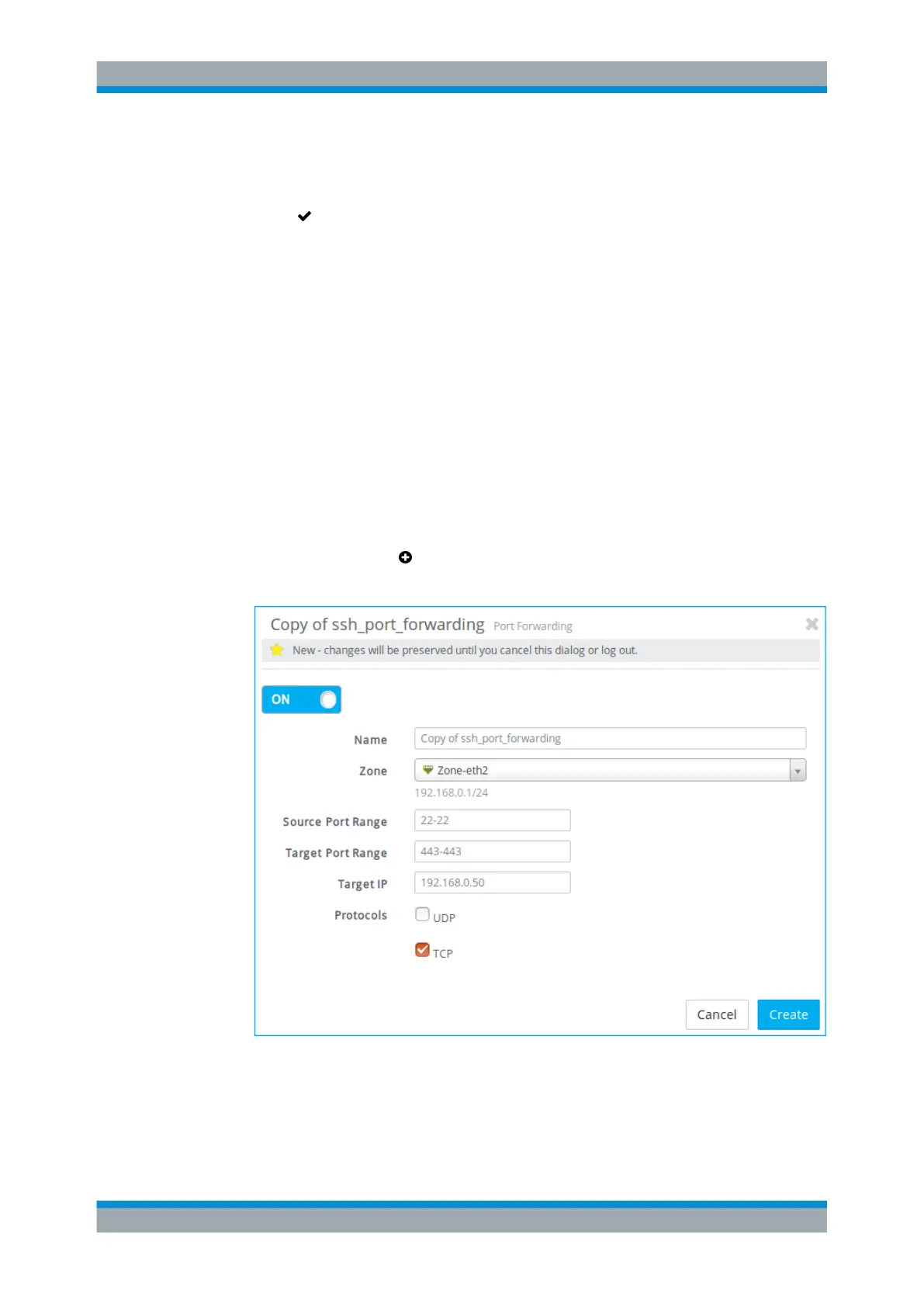 An editor panel is opened, allowing you to configure a port forwarding rule.