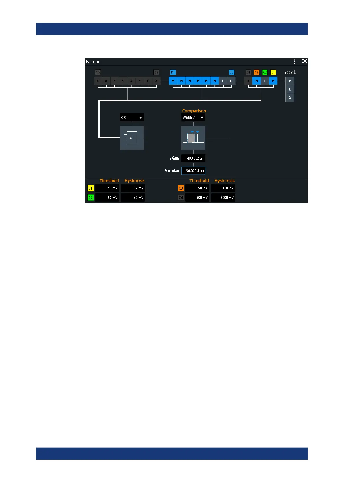 Defines the pattern by selecting the state "H" (high), "L" (low) or "X" (do not care, the