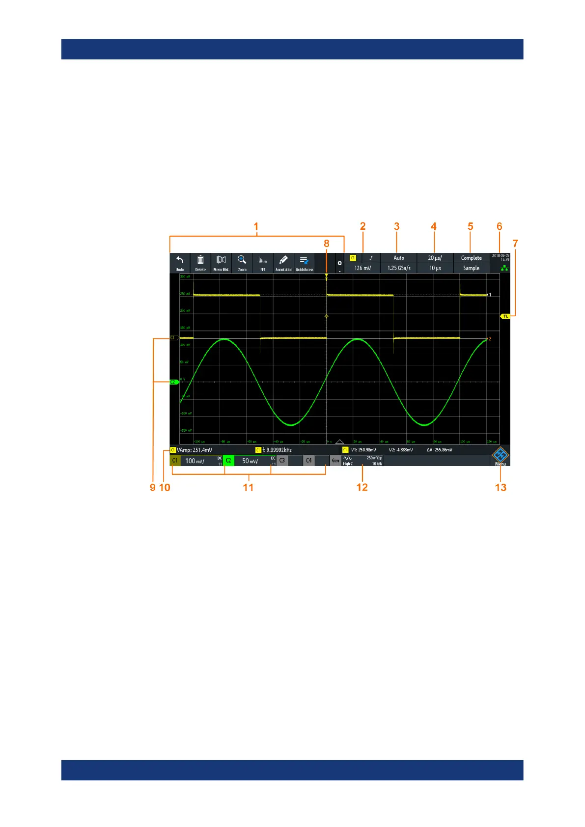 10 = Measurement results (here: automatic measurements on the left, cursor measurements on the right)