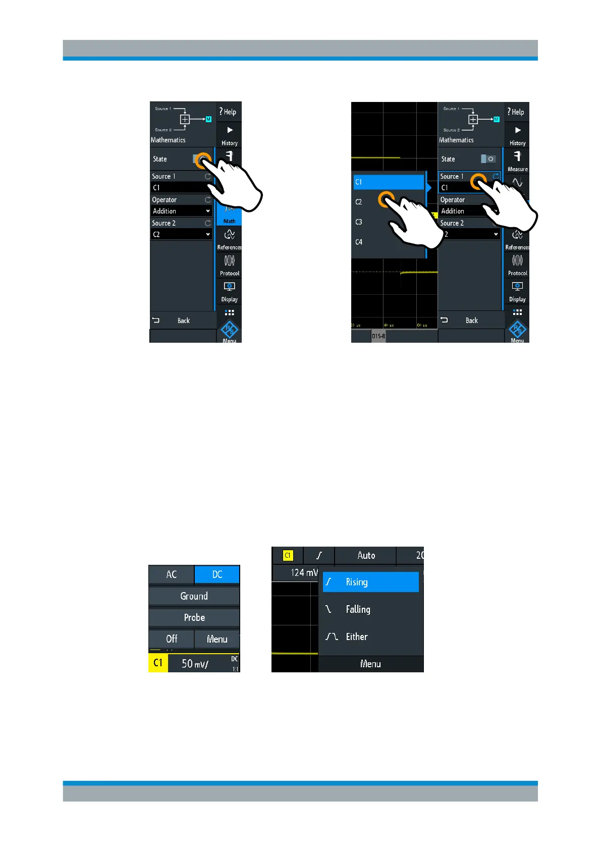 Bild 3-4: Kurzmenüs für Kanal (links) und Triggerflanke (rechts)